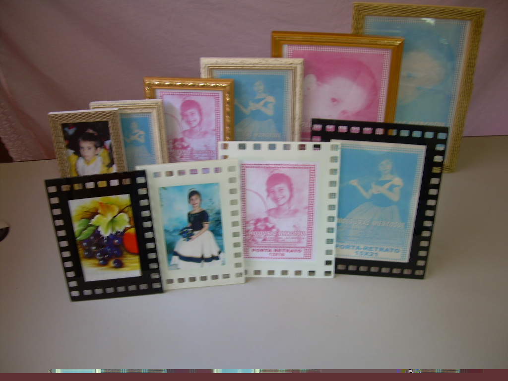 Porta-retratos de vidro serigrafados, com fundo de eucatex com gravata articulada, posicionando-se horizontal e verticalmente. Fácil remoção da foto, durável e resistente.